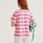 Camiseta de tejido 100% algodón con estampado de rayas de color rosa y blanco. Cuello redondo de color verde y manga corta. La modelo mide 175 cm y lleva la talla S.