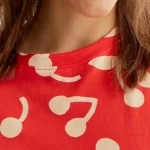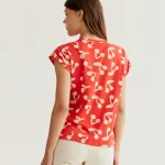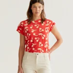 Camiseta de tejido 100% algodón con estampado red guinda. Cuello redondo y manga corta. La modelo mide 177 cm y lleva la talla S.