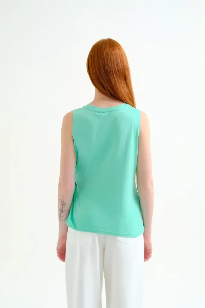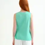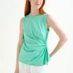 Camisa de tejido 100% algodón de color verde. Cuello redondo y sin mangas. Detalle de drapeado lateral. La modelo mide 177 cm y lleva la talla S.