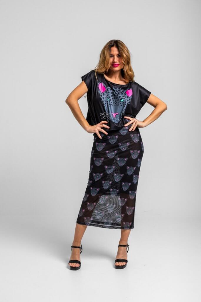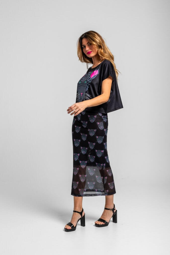 Falda tul ajustada negra con panteras: Falda midi de tejido elástico. Modelo ajustado, con estampado vectorial. – 95% Poliéster y 5% Elastán. – Lavar a máquina en agua fría. No usar blanqueador. No usar secadora. Secar colgado a la sombra. Planchado a temperatura baja, por debajo de 100 ºC. Planchar del revés. No dejar la plancha parada sobre la prenda. Lavar con colores similares. – TALLA XS: Medida de la cintura 30 cm, medida de la cadera 40 cm y largo del cuerpo 83,5 cm.TALLA S: Medida de la cintura 32 cm, medida de la cadera 42 cm y largo del cuerpo 85 cm.TALLA M: Medida de la cintura 34 cm, medida de la cadera 44 cm y largo del cuerpo 86,5 cm.TALLA L: Medida de la cintura 36 cm, medida de la cadera 46 cm y largo del cuerpo 88 cm.TALLA XL: Medida de la cintura 38 cm, medida de la cadera 48 cm y largo del cuerpo 89,5 cm.TALLA XXL: Medida de la cintura 40 cm, medida de la cadera 50 cm y largo del cuerpo 91 cm. – Las medidas de las prendas pueden presentar pequeñas variaciones debido al proceso de producción de hasta 2 cm.