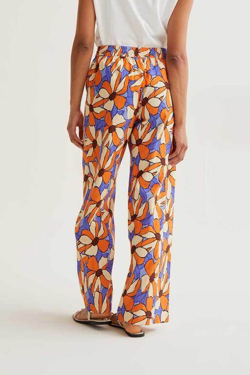 Pantalón con tejido 100% algodón con estampado marigold. Cintura elástica de tiro alto ajustable con cordones. Bolsillos laterales. La modelo mide 173 cm y lleva la talla S.