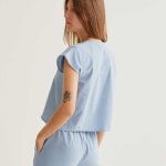 Camisa de tejido 100% algodón de color azul claro. Cuello redondo y manga corta. Cierre frontal con botones ocultos con detalles de margaritas. La modelo mide 177 cm y lleva la talla S.