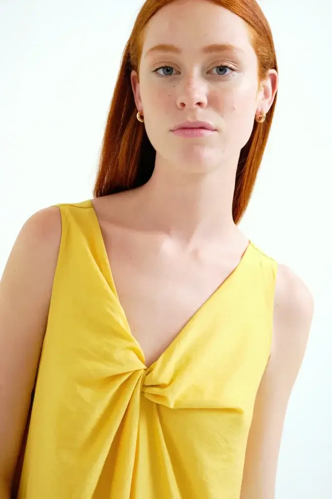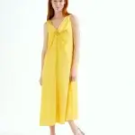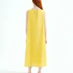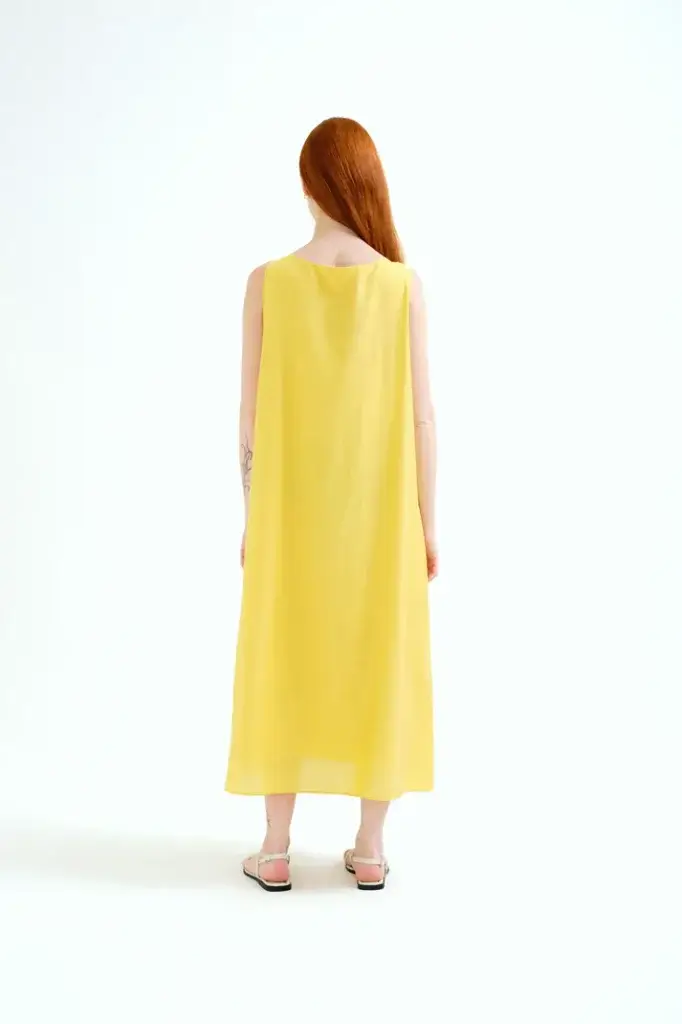 Vestido largo de tejido crepé satinado de color amarillo. Escote redondo y sin mangas. Detalle anudado en el pecho. Forro interior. La modelo mide 175 cm y lleva la talla S.