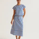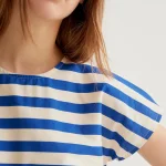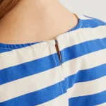 Top de tejido 100% algodón con estampado bamboo blue. Cuello redondo y manga corta. Cierre trasero con botón oculto en escote pico. La modelo mide 177 cm y lleva la talla S.